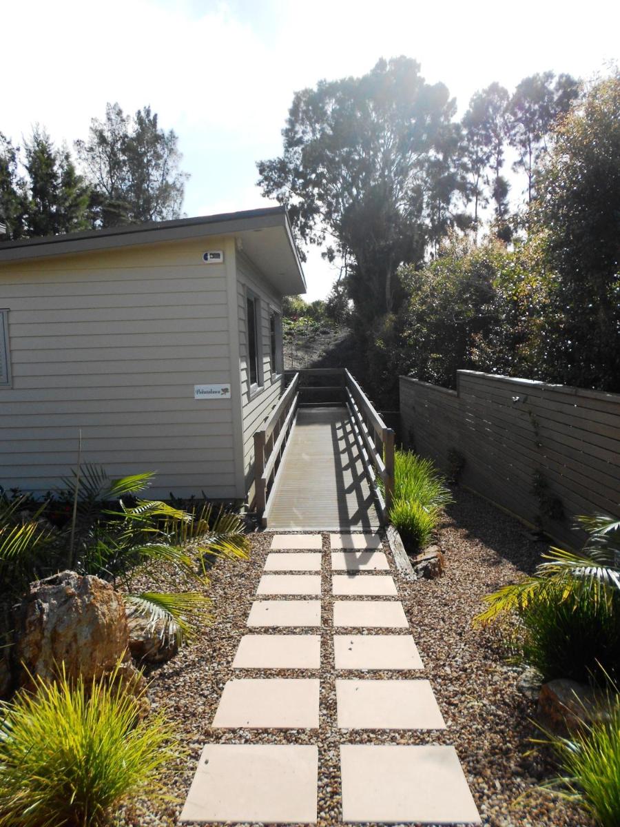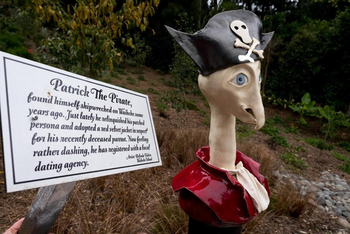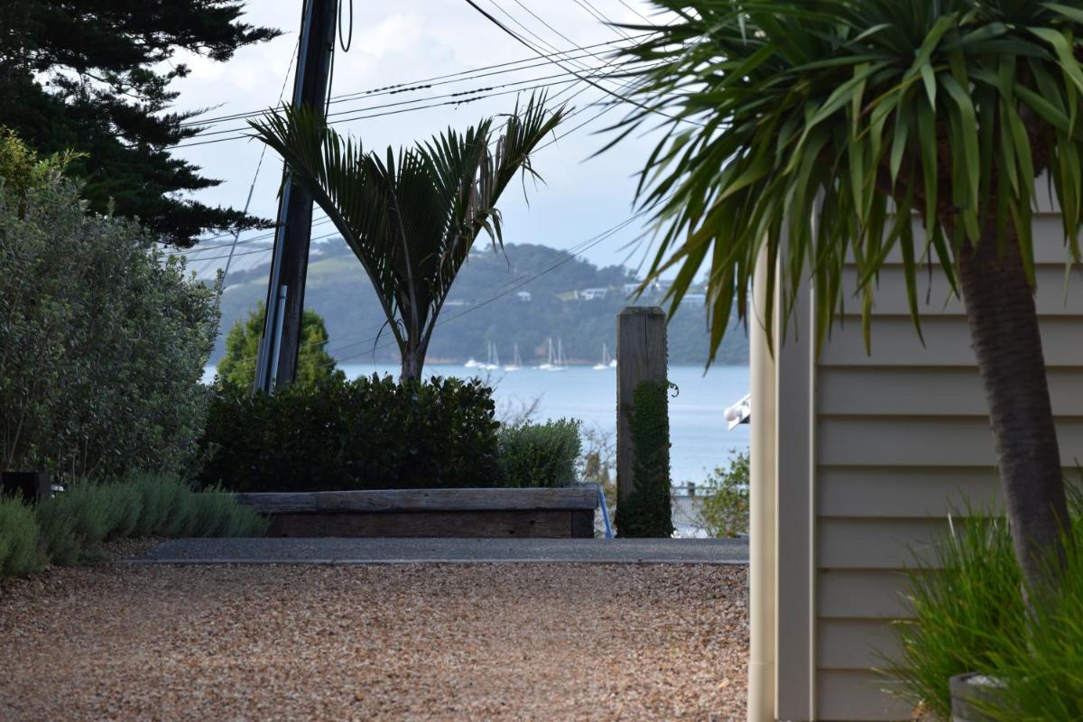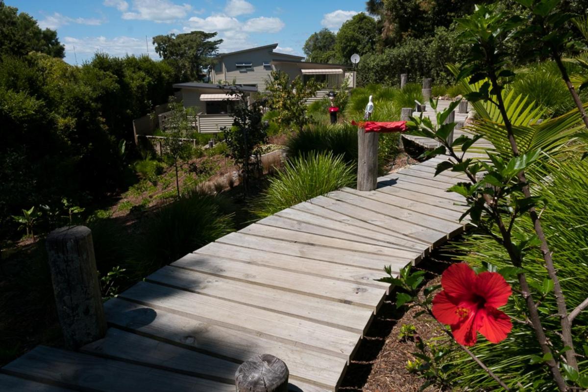 Outdoor photos highlight the landscaped garden, with native plants, shaded seating, and boardwalk paths that connect the spaces. Views from the decks show greenery all around, reinforcing the sense of seclusion. Pictures of the surrounding area—beaches, vineyards, and Oneroa Village—round out the gallery, emphasizing the apartments’ blend of privacy and proximity.
