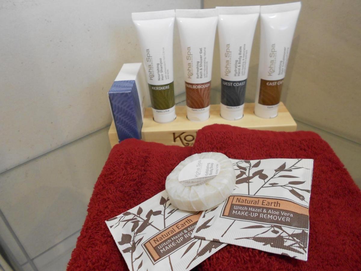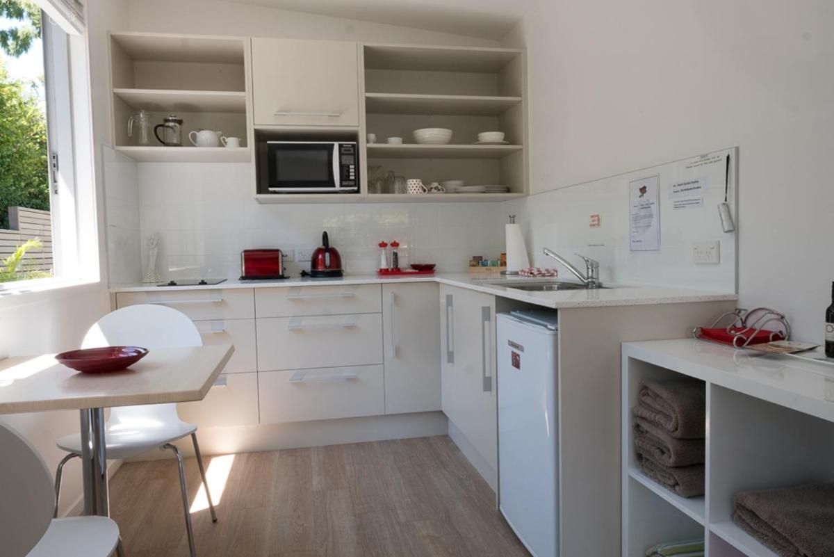 Images showcase the cottage-style studios set within lush gardens. Interiors feature queen beds, kitchenettes, and modern bathrooms, with sliding doors opening to private decks. The distinct color schemes of Pohutukawa and Paua give each unit its own personality.
